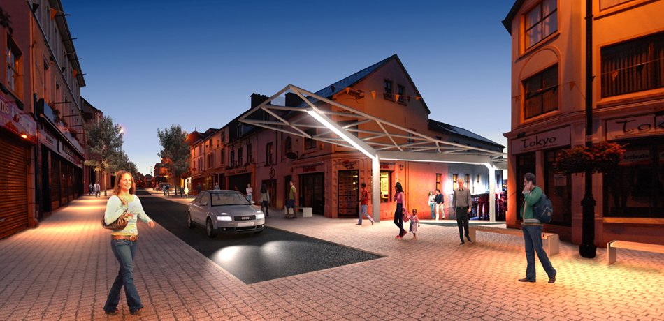 Entwurf Lichtdach-Wetterschutzkombination bei Nacht, mit MacGabhann Architects